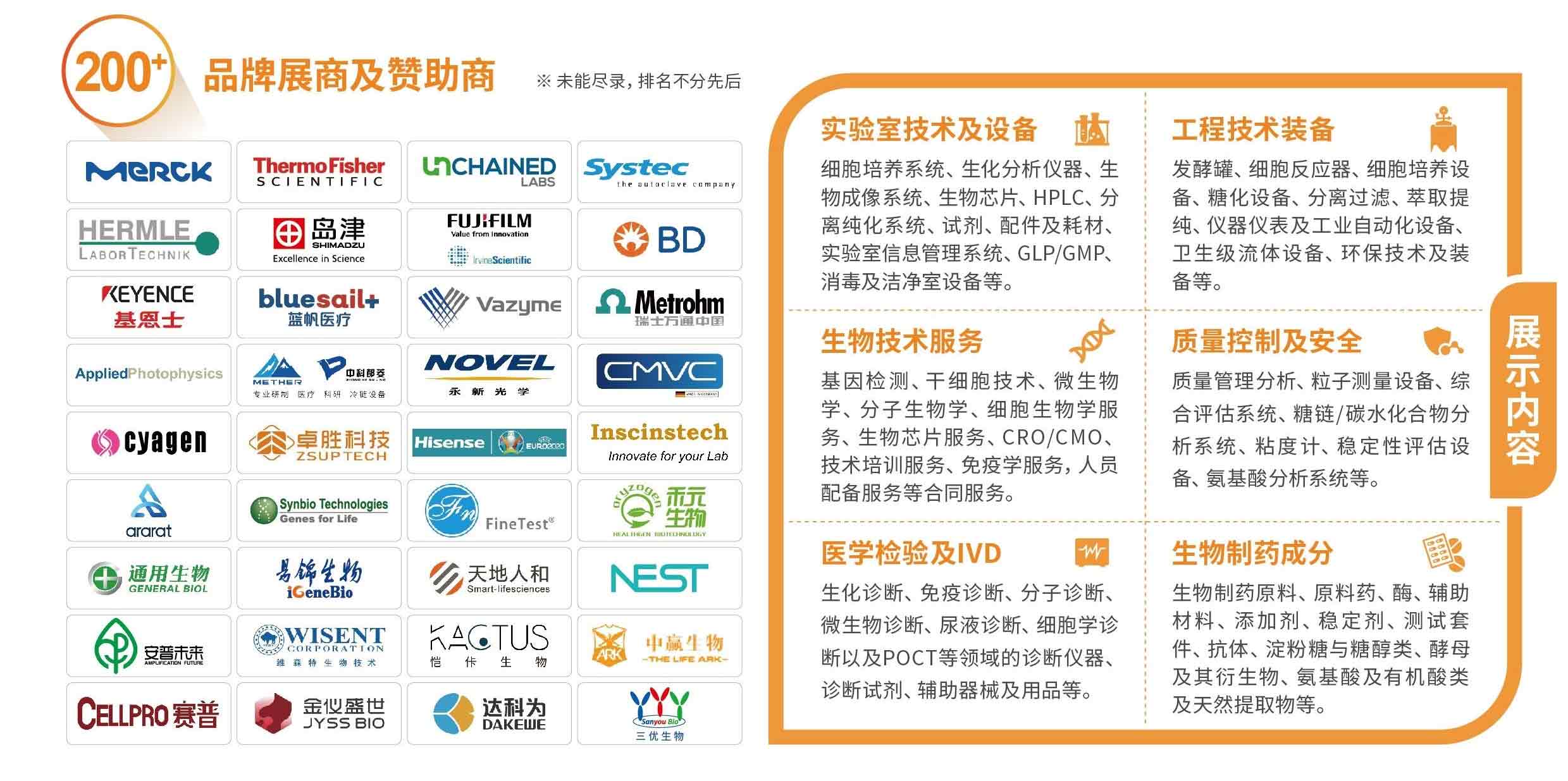 ThermoFisher、MERCK、Unchained Labs、Bio-Bad、岛津、SONY、BD、FUJIFILM、基恩士、诺唯赞、昭衍新药、药明生物、英国应用光、赛业生物、赛信通、罗氏诊断、麦克奥迪、蓝帆医疗、洁特生物、三优生物、中科都菱、路明克斯、德国CMVC、塞锶钛氪、广东药康、燃石医学、亿胜生物科技、SCIEX中国、北京全式金、泓迅科技、三优生物、美国科尔帕默、美国路明克斯、北京维通利华等海内外知名参展企业携手集中促进生物产业高端化、规模化、集约化发展。