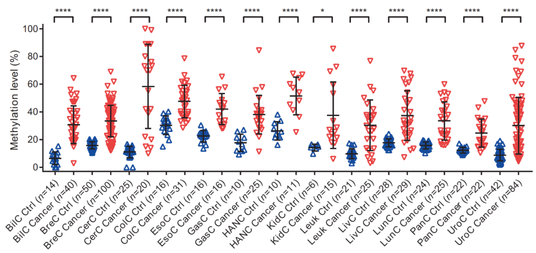 图9. 在13种肿瘤的临床样本中PCDHGB7均显著高甲基化