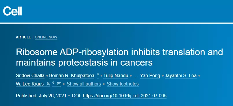 2021年7月30日,位于达拉斯的UT西南医疗中心发现了卵巢癌的致命弱点,以及新的生物标记物,可以指出哪些患者是新疗法的最佳候选者。部分是利用德克萨斯大学西南实验室的塞西尔·H.和艾达·格林生殖生物学科学中心的研究工具得出的。近期,研究人员将这项研究发布在Cell杂志上,发表了题为:“Ribosome ADP-ribosylation inhibits translation and maintains proteostasis in cancers”的论文。