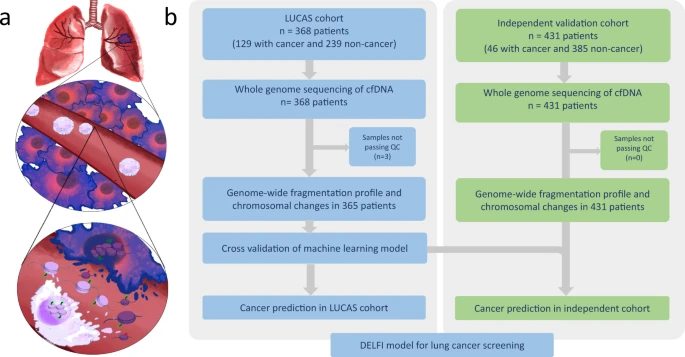 在该研究中,来自约翰霍普金斯大学的研究人员与丹麦和荷兰的研究人员合作,首先对365名参加为期七年的丹麦卢卡斯研究的人(LUCAS队列),对他们血液样本中的cfDNA进行了基因组测序。其中LUCAS队列代表了一组前瞻性收集的三百多例主要症状患者,这些患者在哥本哈根Bispebjerg医院的呼吸内科,胸部X光或胸部CT检查呈阳性。被诊断为患有已知活动性疾病的癌症患者或登记时正在接受治疗的患者被排除在外。所有患者都提供了书面知情同意书。LUCAS研究得到了丹麦区域伦理委员会和丹麦数据保护局的批准。所有患者在第一次就诊时都采集了血样,然后才有可能确诊为肺癌。