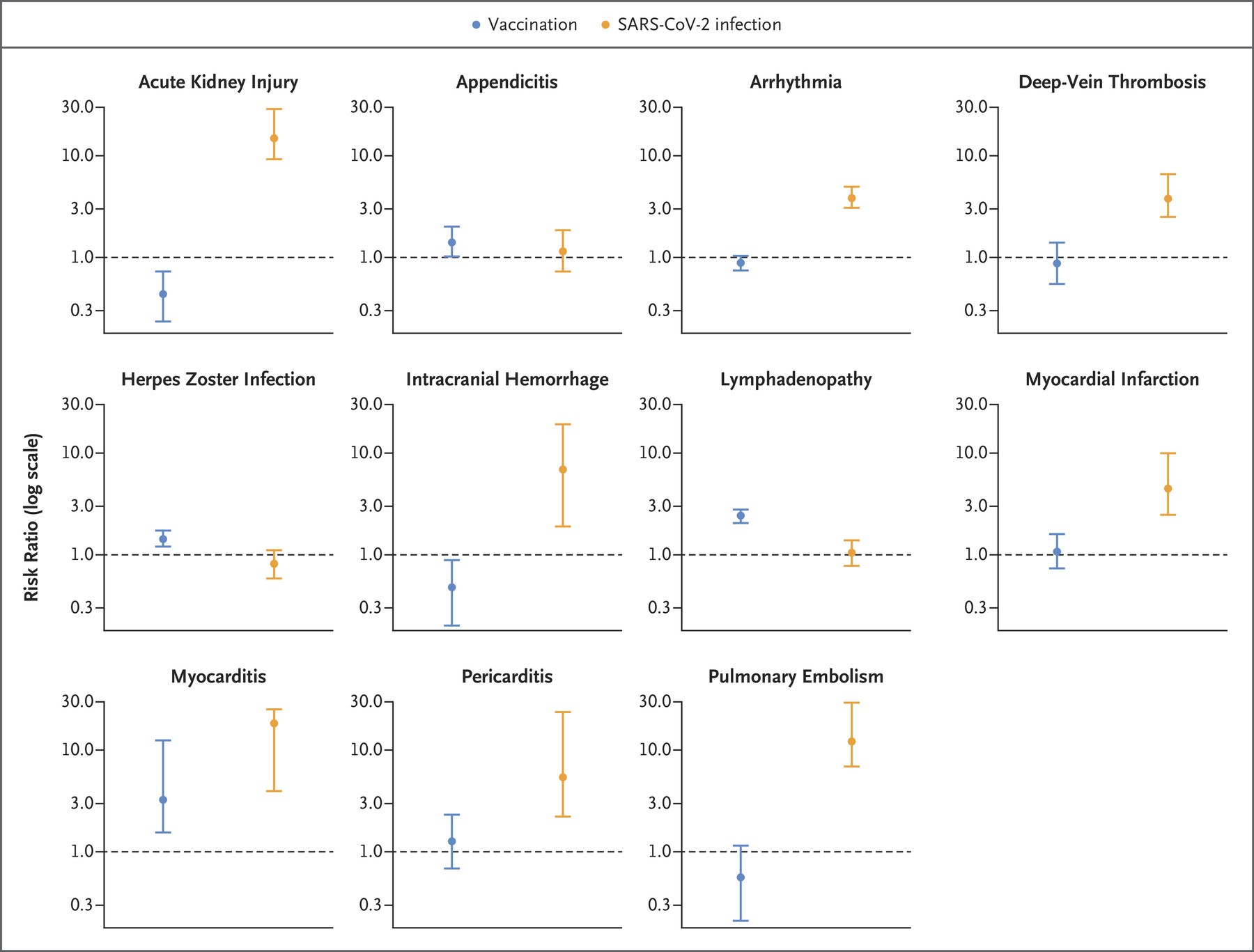 与疫苗相关的较少不良反应数量相比,未接种疫苗患者中与新冠病毒感染相关的多种严重不良反应事件则发生率很高,包括:心律失常(增加3.8倍,每10万名感染者中多增加166例患者)、肾损伤(增加14.8倍;每10万例中多增加125例)、心包炎(增加5.4倍;每10万例中多增加11例)、肺栓塞(增加12.1倍;每10万例多增加62例)、深静脉血栓形成(增加3.8 倍;每10万例多增加43例)、心肌梗塞(增加4.5倍;每10万例多增加25例)和中风(增加2.1倍;每10万例多增加14例)。