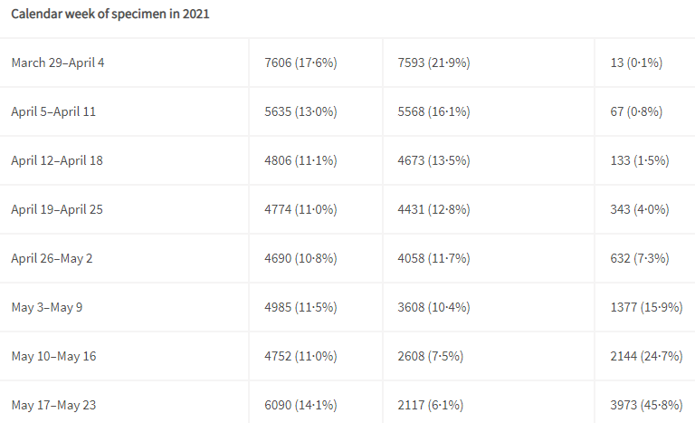 在这项最新的新冠病毒研究中,研究者分析了2021年3月29日至5月23日期间,英国43338例阳性新冠病毒病例的医疗数据,包括疫苗接种状况、急诊科就诊、入院情况和其他人口学特征。在这项研究所包括的所有病例中,从患者身上采集的病毒样本都进行了全基因组测序,以确认是哪种变异引起了感染。在研究期间,有34656例Alpha型变异(80%)和8682例Delta型变异(20%)。虽然Delta在整个研究期间的比例为20%,在2021年5月17日开始的一周内,新的新冠病例占三分之二(65%, 3,973/6,090),这表明它已经超过了Alpha,成为英国的主要变异。
