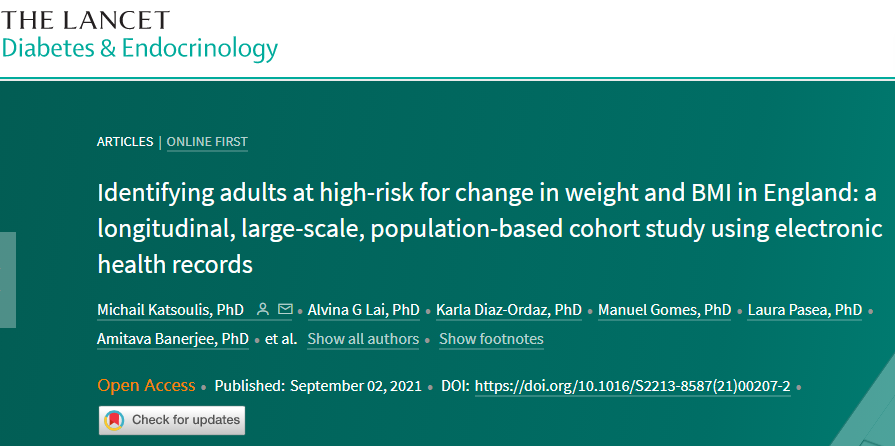 这项研究发布在了《The Lancet Diabetes & Endocrinology》杂志上,发表了一篇题为“Identifying adults at high-risk for change in weight and BMI in England: a longitudinal, large-scale, population-based cohort study using electronic health records”的文章。研究发现,与性别、种族、地理区域或社会经济区域特征相比,年轻成人是体重增加的更重要风险因素。体重增加的风险不仅在最年轻的成人年龄组中最高,而且随着年龄的增长而稳步下降。