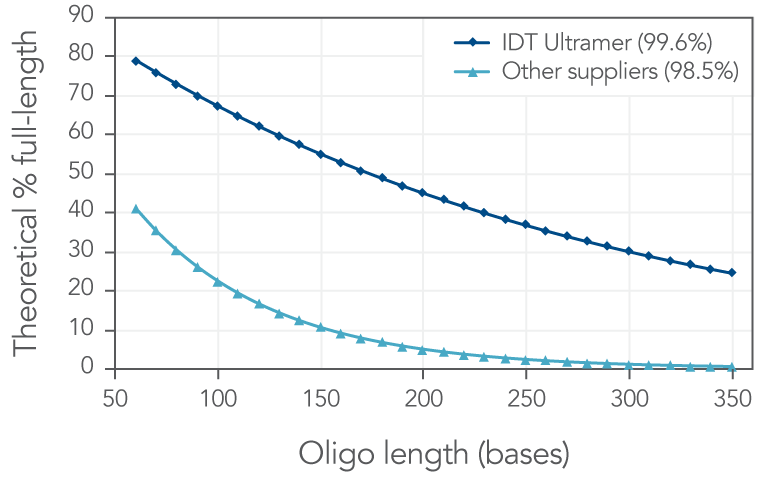 寡核苷酸在专有的合成平台上合成,该平台提供高于行业标准的耦合效率。如图所示,随着寡核苷酸长度增加,耦合效率愈加重要。