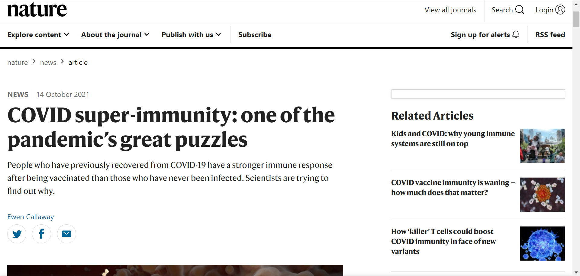 该文章于昨日(10月14日)发表在《Nature》上,名为“COVID super-immunity: one of the pandemic’s great puzzles”。