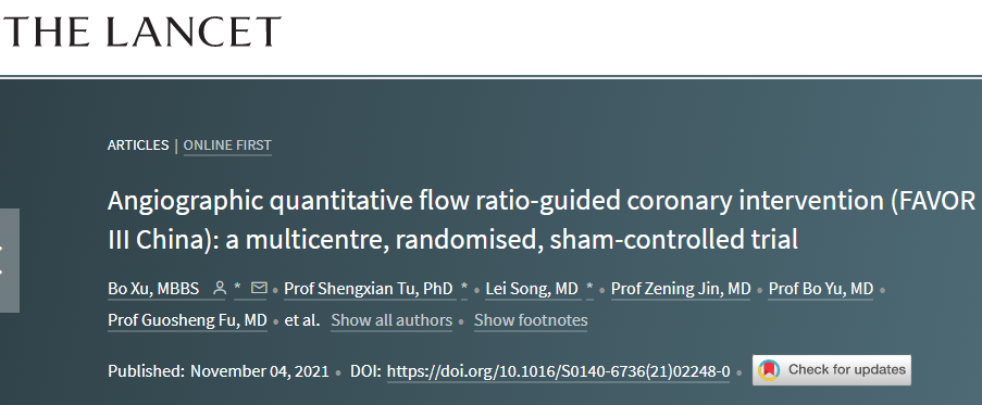 这项研究首次分析了QFR及其相关临床结果,可能促使QFR广泛用作血管造影或压力导丝的替代方法,以测量冠状动脉疾病患者堵塞或病变的严重程度。该研究结果作为一项突破性的临床试验于11月4日(周四)在经导管心血管治疗会议 (TCT 2021)上宣布,并同时发表在《The Lancet》杂志上,题为“Angiographic quantitative flow ratio-guided coronary intervention (FAVOR III China): a multicentre, randomised, sham-controlled trial”。