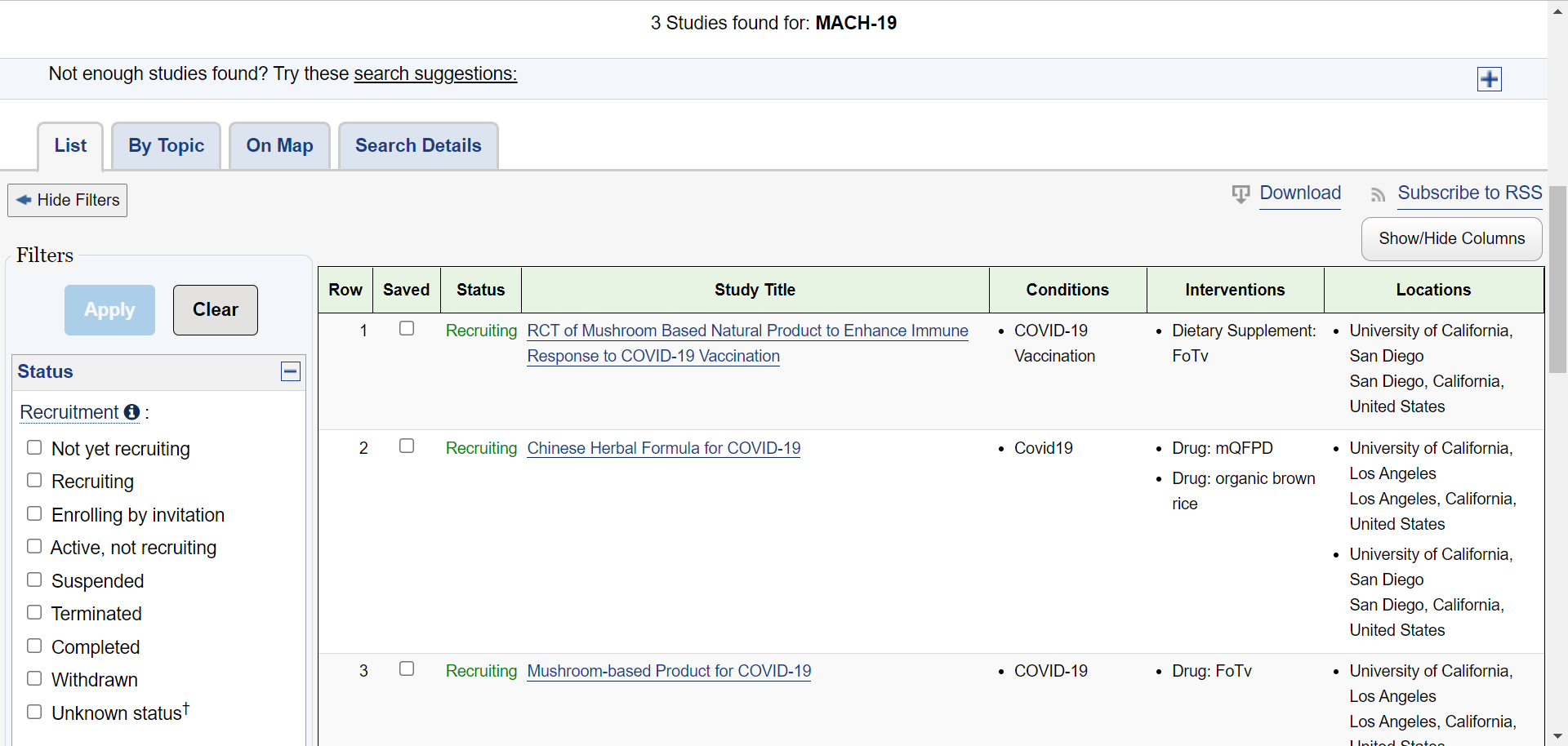 MACH-19的第三个正在进行的试验“RCT of Mushroom Based Natural Product to Enhance Immune Response to COVID-19 Vaccination”,测试在人们首次接种疫苗时,给他们服用药用菌胶囊,是否可以增加抗体和其他的免疫反应。该试验从2021年6月开始,计划于2022年6月结束。
