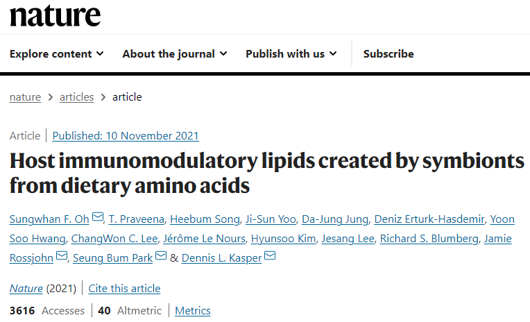 近日,发表在《Nature》杂志上的研究结果为饮食、肠道微生物群和免疫功能之间复杂的相互作用提供了统一的解释。这是美国哈佛医学院、美国布里格姆妇女医院、首尔国立大学和澳大利亚莫纳什大学科学家合作的成果。研究人员发表了一篇题为“Host immunomodulatory lipids created by symbionts from dietary amino acids”的文章: