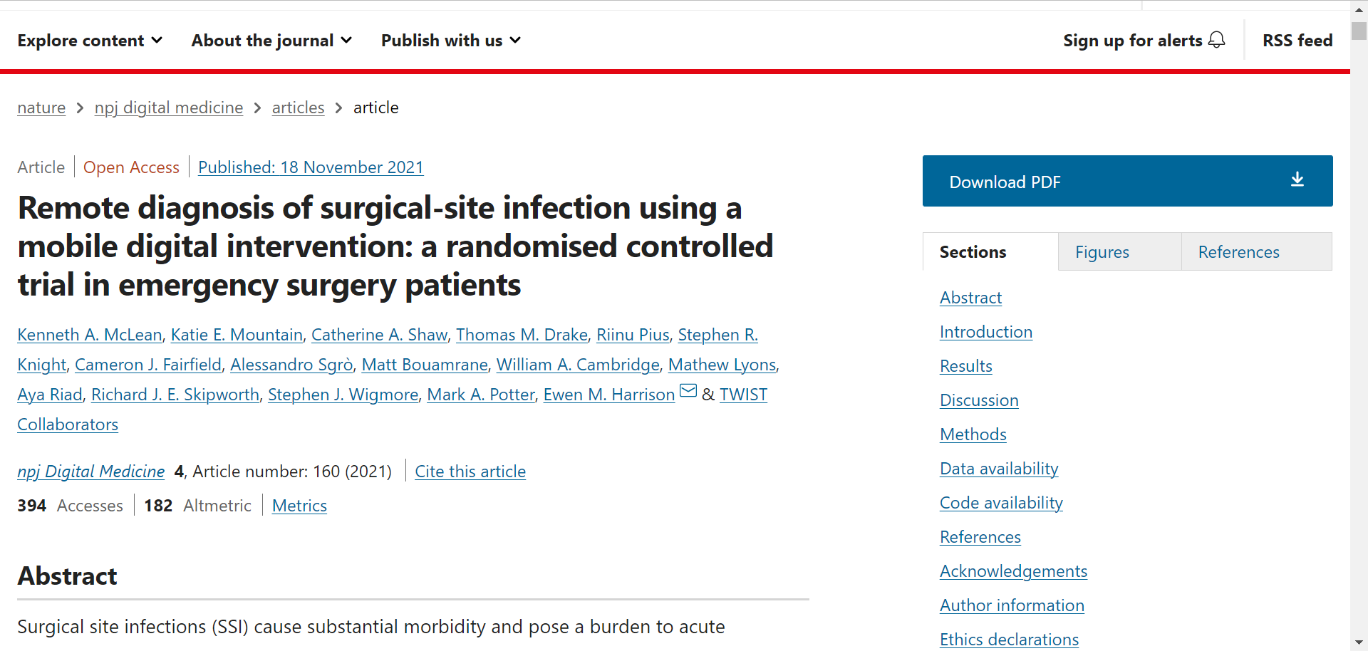 该研究于11月18日发表在《npj Digital Medicine》上,文章名为“Remote diagnosis of surgical-site infection using a mobile digital intervention: a randomised controlled trial in emergency surgery patients”。