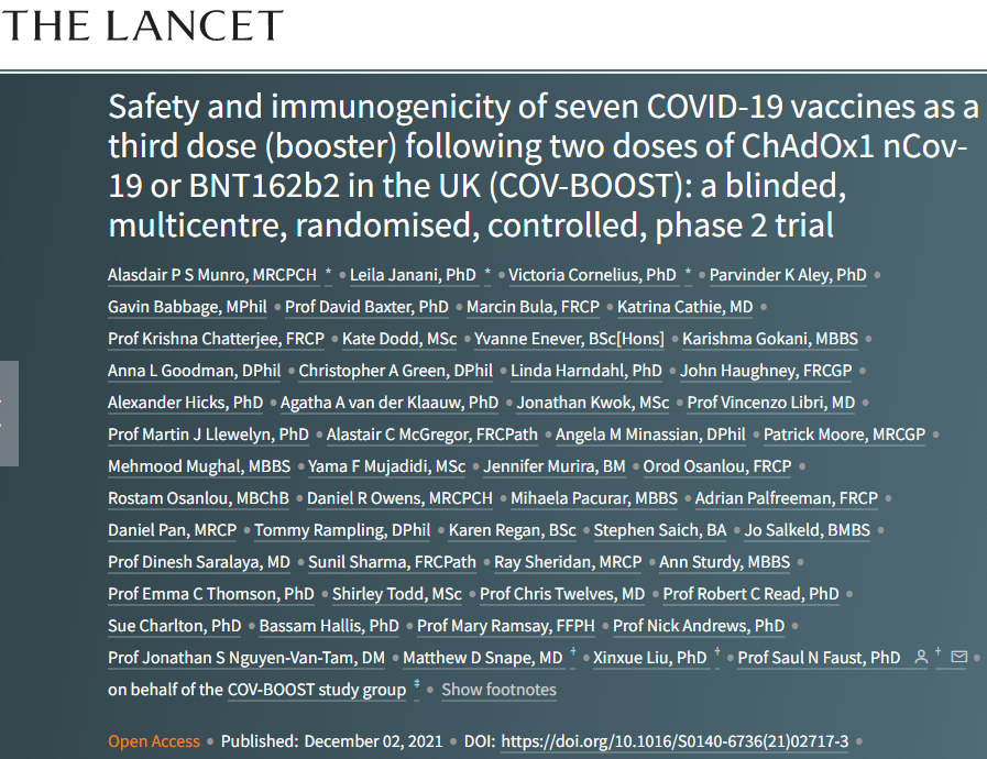 COV-BOOST研究考察了七种疫苗作为第三剂加强注射时的安全性、免疫反应(免疫原性)和副作用(反应原性)。研究的疫苗有ChAd,BNT,NVX-CoV2373(Novavax[NVX]),Ad26.COV2.S(Janssen[Ad26]),Moderna[mRNA1273],VLA2001(Valneva[VLA])和CVnCov(Curevac[CVn])。