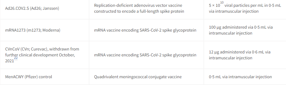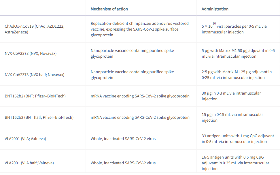 试验的13个实验和对照组(7个疫苗加3个半剂量和3个对照组)分成3个参与者组,每组6个位点。A组接受NVX,半剂量NVX,ChAd或对照。B组接受BNT,VLA,半剂量VLA,Ad26或对照。C组接受Moderna,CVn(于2021年10月退出进一步的临床开发),半剂量BNT或对照。