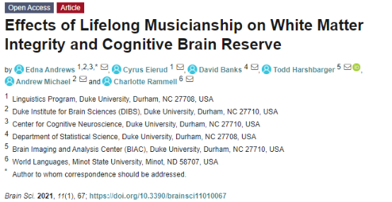 2021年初,Andrews和她的团队发表的首批研究之一,研究音乐在建立认知和大脑储备方面的影响,题为“Effects of Lifelong Musicianship on White Matter Integrity and Cognitive Brain Reserve”。简单地说,认知和大脑储备是一种在面对各种病理时鉴定大脑复原力的方法。高水平的认知储备可以帮助防止痴呆、帕金森病或多发性硬化症持续数年。这些水平是通过大脑灰质和白质的结构测量来量化的。白质可能被认为是帮助大脑不同区域交流的绝缘线。