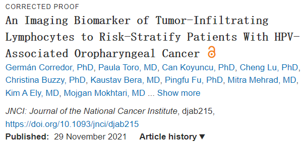 他们的研究最近发表在《Journal of the National Cancer Institute》上,题为“An Imaging Biomarker of Tumor-Infiltrating Lymphocytes to Risk-Stratify Patients With HPV-Associated Oropharyngeal Cancer”。