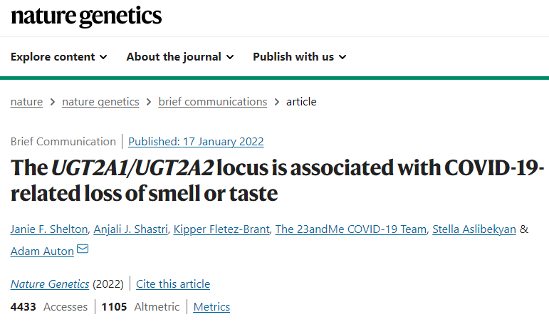2022年1月17日,23andMe公司的研究小组在《Nature Genetics》上发表了一篇文章,题为”The UGT2A1/UGT2A2 locus is associated with COVID-19-related loss of smell or taste“。文章指出,新冠感染者嗅觉味觉失灵的症状,与嗅觉上皮细胞中,两个嗅觉基因附近的一个基因位点有关。