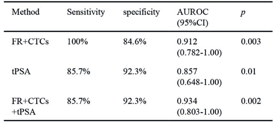 北京大学肿瘤医院关于FR+CTC在前列腺癌的检测准确度以及不同tPSA和f/tPSA分组中FR+CTC水平差异的研究(Front.Oncol. 2021; 11: 708214)发现,在tPSA<10ng/mL、f/tPSA<0.16的前列腺癌患者中,FR+CTC相比tPSA具有更优的检测性能(AUROC 0.912 Vs.0.857),FR+CTC在前列腺癌检测中具有较高的准确度,尤其对于灰区的可疑前列腺癌患者,FR+CTC具有更优的表现。