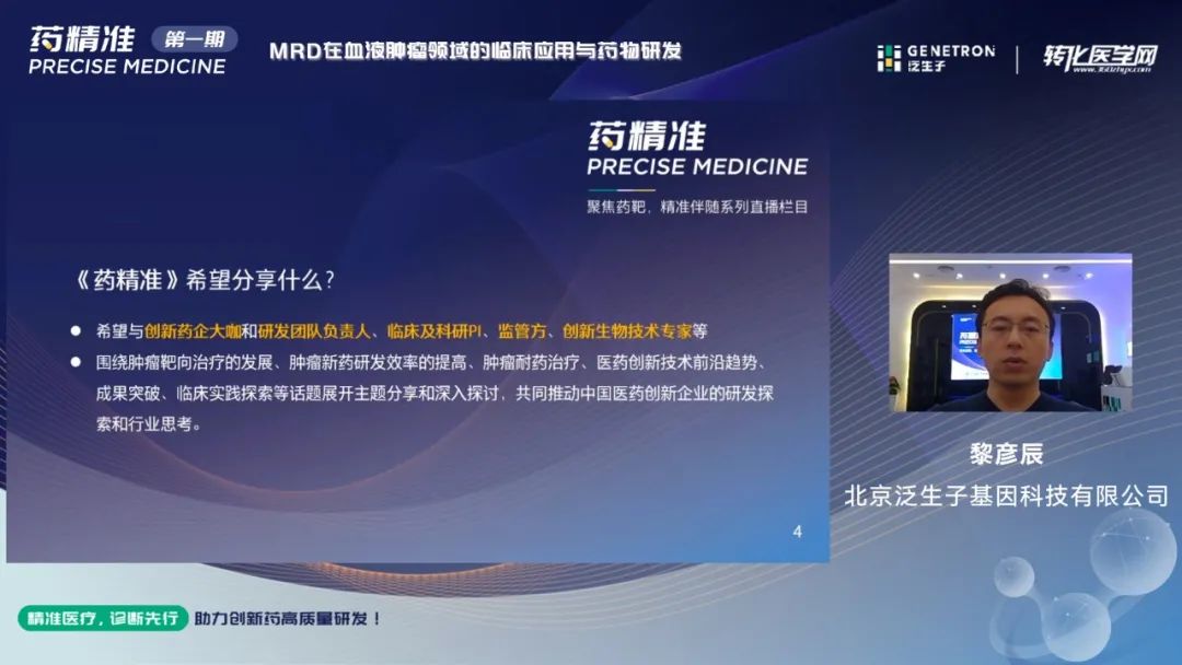 首先,直播由受邀主持嘉宾泛生子药企合作部门高级总监黎彦辰博士进行开场,黎博士介绍了《药精准》系列直播栏目的初衷和后续安排,并对线上各位参会的嘉宾与观众朋友们表示了热烈的欢迎,感谢各位专家在百忙之中抽出时间参与《药精准》首期线上直播。