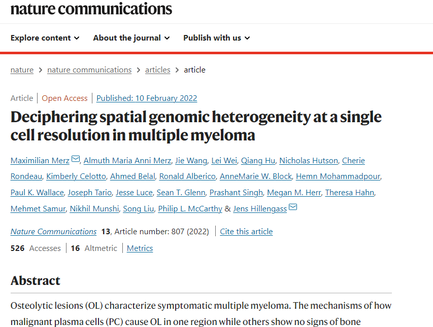 该研究团队由多学科专家组成,在此类前瞻性临床试验中,这是前所未有的,其中包括骨髓瘤科主任、医学博士Jens Hillengass和罗斯威尔帕克综合癌症中心的移植与细胞治疗名誉主任Philip McCarthy博士。研究人员通过结合单细胞RNA测序和图像引导的骨髓瘤骨病病变活检,发现复发/难治性、新诊断多发性骨髓瘤患者存在巨大的空间异质性。这项研究于2月10日发表在《Nature Communications》上,题为:“Deciphering spatial genomic heterogeneity at a single cell resolution in multiple myeloma” 该研究将恶性、致病浆细胞的积累与骨髓瘤骨病的发展联系起来,为多发性骨髓瘤研究领域长期存在的问题提供了答案,而这些问题可能会改变疾病的诊断和治疗方式。