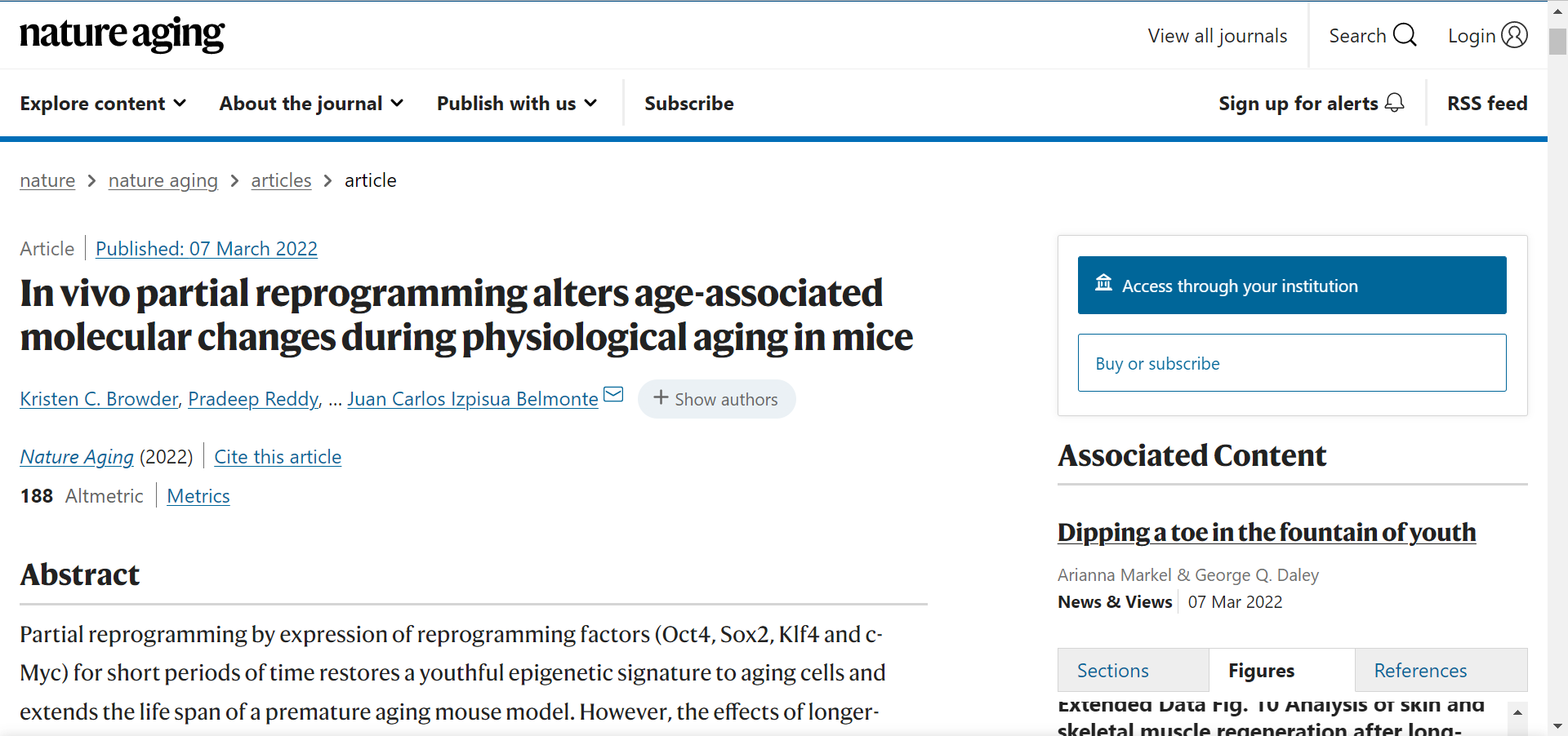 昨日(3月7日),这篇研究论文发表于《Nature aging》,题为“In vivo partial reprogramming alters age-associated molecular changes during physiological aging in mice”。