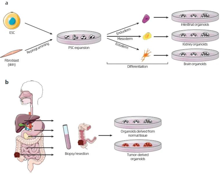 类器官如此火热,如何获得类器官成为大家比较关注的问题。类器官的获得一般有几种不同的策略:(a)多能干细胞(PSC)来源的类器官 重编程成纤维细胞或胚胎干细胞(ESCs)为诱导多能干细胞,然后分化为三个胚层(内胚层、中胚层和外胚层),特定的分化方案可用于获得感兴趣的组织,如肠、肾和脑。(b)成体干细胞来源的类器官 使用多种器官(包括正常肝脏、胰腺和肠道)或发生在这些器官中的肿瘤活检或切除样本,然后这些样本分别用于获得来自正常人的类器官或者肿瘤类器官。(2)