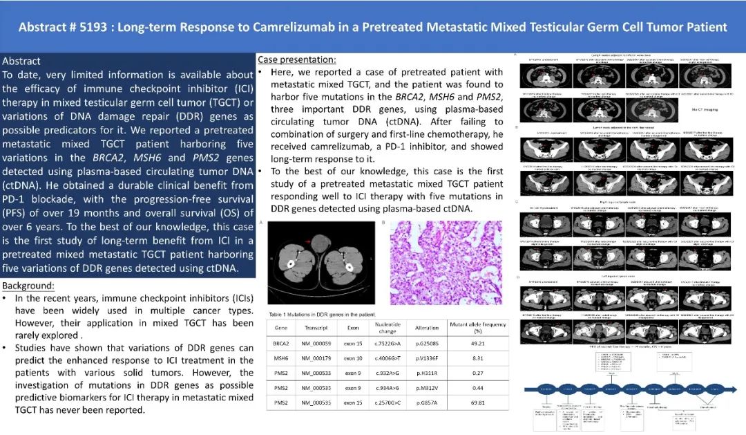 研究内容:一例患有混合性睾丸生殖细胞瘤19岁男性患者,携带BRCA2, MSH6和PMS2基因共5个变异,经过Camrelizumab治疗后,取得了19个多月的疾病无进展期和6年多的总生存期。