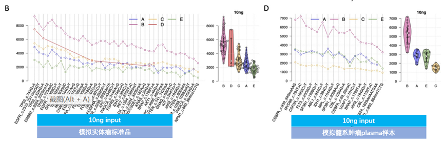 但在VAF到达0.5%以下的 “挑战区” 时,不同panel的表现开始呈现显著的差异。当VAF为0.125%时,不管在实体瘤标准样品组或在髓系肿瘤标准样品组的评比中,慧渡医疗(图中assay B)均为灵敏度最佳的NGS液态活检panel:VAF为0.125%时,(实体瘤组)灵敏度>95%,(髓系肿瘤组)灵敏度100%。
