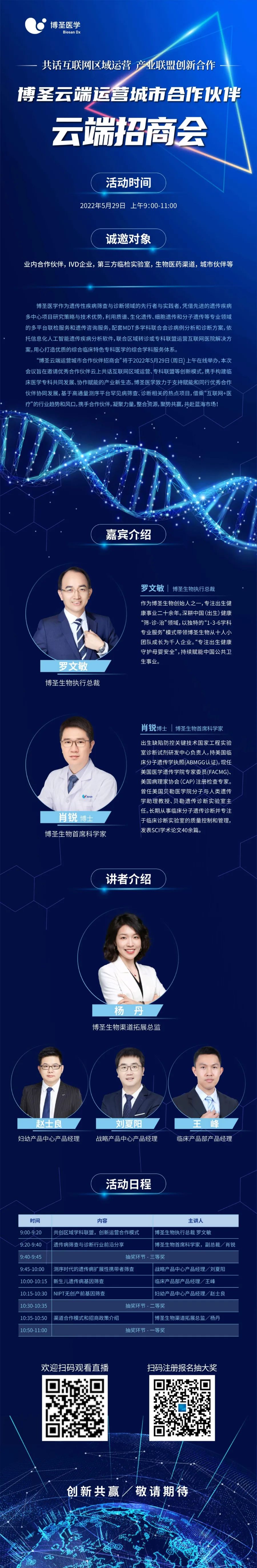 博圣医学致力于支持赋能和同行优秀合作伙伴协同发展,基于高通量测序平台罕见病筛查、诊断相关的热点项目,覆盖一级预防的遗传病扩展性携带者筛查、针对二级预防的无创产前基因检测、针对三级预防的新生儿基因筛查启动全国招商。携手合作伙伴,共话互联网区域运营,聚焦学科联盟创新模式,凝聚力量,整合资源,共赢百亿蓝海市场!