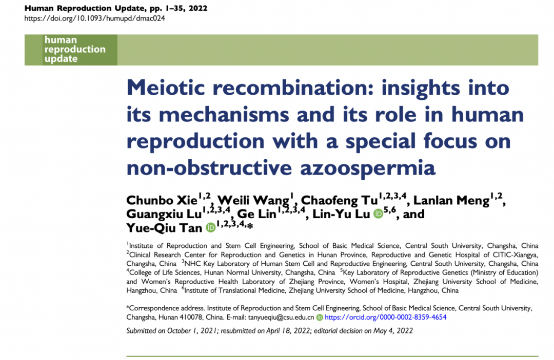 近日,中信湘雅生殖与遗传专科医院卢光琇、林戈教授团队谭跃球课题组在Human Reproduction Update杂志上发表了题为“Meiotic recombination: insights into its mechanisms and its role in human reproduction with a special focus on non-obstructive azoospermia”的综述性文章。该文通过梳理近几十年来国内外相关研究进展,结合课题组研究成果,全面系统总结了减数分裂同源重组的分子机制,深入剖析了重组缺陷与配子发生失败间的关系,整理了迄今为止已发现导致NOA和POI的基因,并基于此对疾病的个性化诊疗方案进行了阐述。