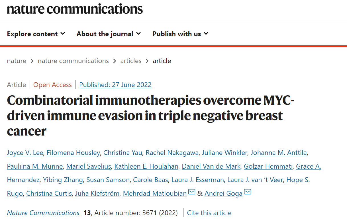 乳腺癌的疾病分型多种多样,其中三阴性乳腺癌因预后极差被称为“乳腺癌之王”。整体乳腺癌的生存情况较其他癌症要好,但晚期三阴性乳腺癌的5年生存率仅为11%。很少有三阴性乳腺癌(TNBC)患者受益于免疫检查点抑制剂,完全和持久的缓解非常罕见。癌基因可以调节肿瘤免疫浸润,然而癌基因是否决定对免疫治疗的反应减弱以及这些影响是否是可逆的,仍然知之甚少。近日,来自加州大学旧金山分校的研究团队通过将TLR9激动剂和针对OX40的激动剂抗体与抗PD-L1相结合,应用于临床小鼠试验后,经历肿瘤消退并免受新的TNBC肿瘤生长的影响。该研究发表在《Nature Communications》杂志上,题为“Combinatorial immunotherapies overcome MYC-driven immune evasion in triple negative breast cancer”。这项研究意味着MYC依赖性免疫逃逸是可逆和可药物的,当战略靶向时,可能会改善用免疫检查点抑制剂治疗的患者的预后。