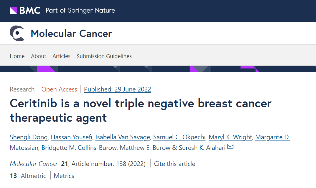 6月29日,来自LSU Health New Orleans schools of Medicine and Graduate Studies的研究人员在Molecular Cancer期刊发表了最新研究成果——在对133种FDA已批准的癌症特异性药物进行筛选后,研究确定了两种药物组合,分别成功用以治疗雄性激素受体阳性三阴性乳腺癌(AR+ TNBC)及其他种类三阴性乳腺癌(AR-/AR Low TNBC)。