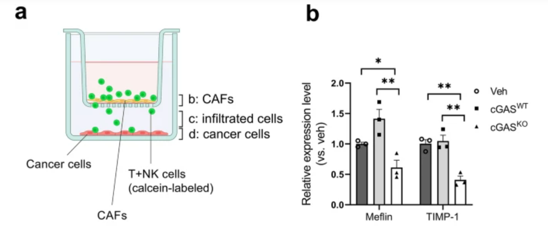 表达cGAS-STING的肿瘤显示出肿瘤抑制性CAFs的标志物升高,以及抗肿瘤免疫细胞在组织基质成分中的强浸润。此外,Transwell共培养实验表明,CAFs的存在减弱了免疫细胞对癌细胞的浸润,但通过激活cGAS-STING信号传导而被废除。这些结果表明,肿瘤中cGAS-STING信号传导的互补将是击败PDACs中CAF路障的有希望的治疗策略。
