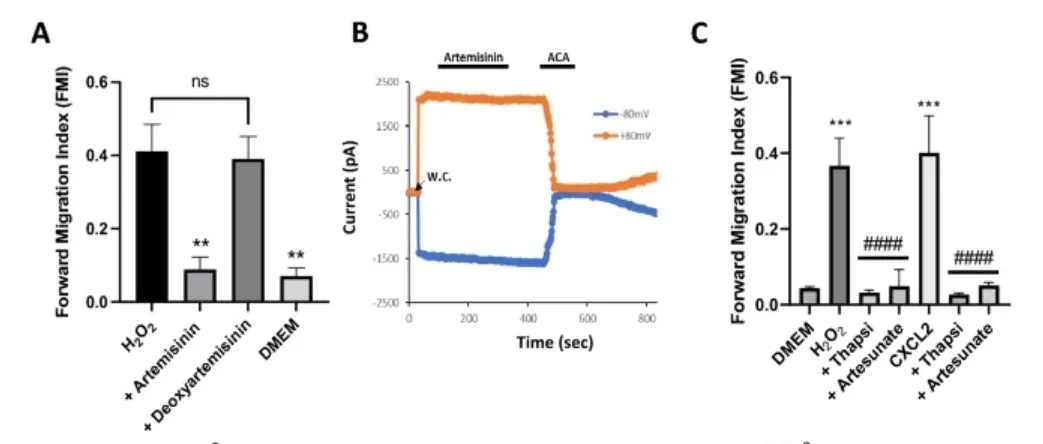 将抗疟化合物青蒿素确定为一系列趋化剂诱导的嗜中性粒细胞和巨噬细胞趋化性的强效和选择性抑制剂。青蒿素从细胞内储存中释放钙的方式与沙普西加林(Sarco/内质网钙ATP酶泵(SERCA)的已知抑制剂)相似,但与他西加林不同,青蒿素仅阻断SERCA3亚型。青蒿素对SERCA3的抑制是不可逆的,并被铁螯合抑制,这表明铁催化的SERCA3中特定半胱氨酸残基的烷基化是青蒿素抑制中性粒细胞运动的机制。
