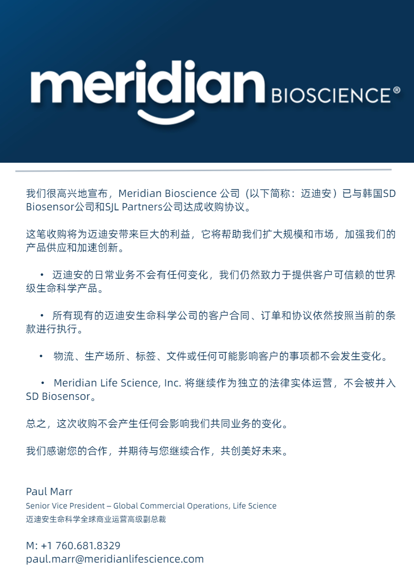 官宣 | Meridian迈迪安与 SD Biosensor达成收购协议