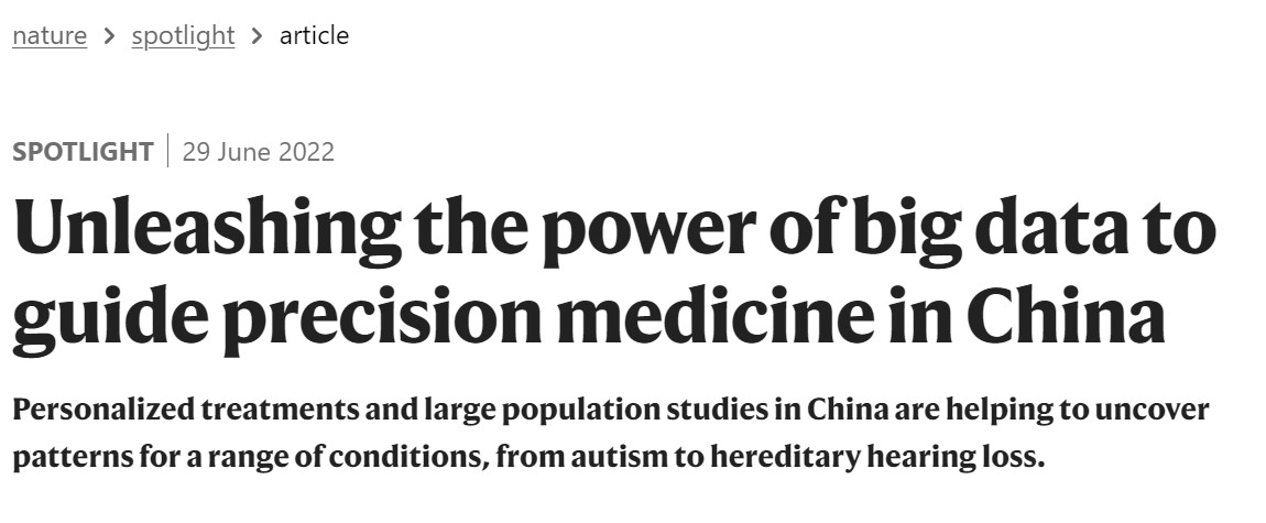 一篇在2022年6月30日发表在《自然》增刊“自然聚焦——中国精准医疗”上的文章,对于精准医疗在从孤独症到遗传性耳聋等一系列疾病,甚至是未来在癌症治疗方面的应用进行了详细描述。