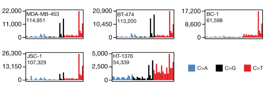 为了研究APOBEC3诱变的机制,研究人员从人类癌细胞系中删除了相关的基因,这些基因随着时间的推移自然产生APOBEC3相关的突变特征。对来自251个乳腺癌,膀胱癌和淋巴瘤癌细胞系克隆的全基因组序列中的非聚类和聚簇特征的分析表明,APOBEC3A缺失减少了APOBEC3相关的突变特征。