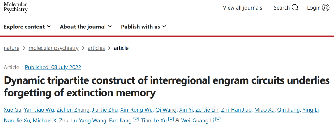 2022年7月8日,复旦大学脑科学转化研究院李伟广研究员、上海交通大学基础医学院徐天乐教授团队和国家儿童医学中心(上海)、上海交通大学医学院附属上海儿童医学中心江帆教授团队合作在Molecular Psychiatry杂志上发表“Dynamic tripartite construct of interregional engram circuits underlies forgetting of extinction memory”的研究论文。研究针对恐惧记忆消退过程中新形成的消退记忆,发现了以内侧前额叶皮层(medial prefrontal cortex, mPFC)为中心的消退记忆印迹神经网络,揭示了消退记忆印迹网络的工作模型,以及跨脑区消退记忆印迹神经连接的动态变化规律,为理解抑郁症、创伤后应激障碍等神经精神疾病治疗后复发提供了科学依据。