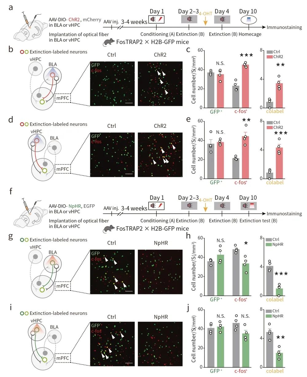 同样地,光遗传学分别失活或激活BLA和vHPC中相关的记忆印迹细胞可抑制或促进恐惧记忆的消退(图2d-g)。这些结果提示了,记忆消退印迹细胞对于消退记忆提取的充分必要性。