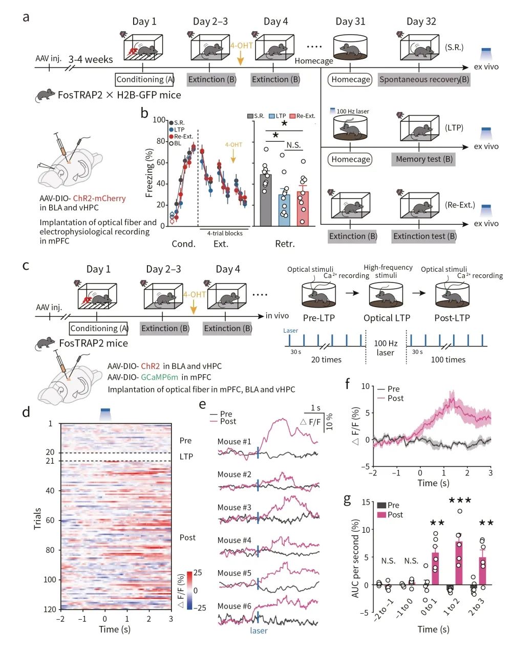 上述双转基因小鼠接受“恐惧记忆消退测试”(ABB测试)或“恐惧记忆重现测试”(ABA测试)(图1d),行为学结果显示,恐惧重现测试引起小鼠更强的恐惧反应(图1e)且c-fos染色结果显示恐惧记忆重现时伴随着消退记忆印迹神经元的抑制。而记忆消退时伴随着这类神经元的再激活(图1f-h)。