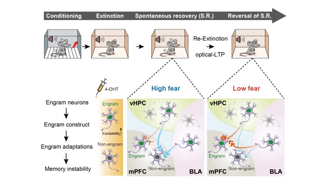 恐惧记忆是生物体适应复杂生存环境的保护性机制之一。然而,过度的、不合理的恐惧记忆对机体却是极其有害的,是导致抑郁症、焦虑症、创伤后应激障碍等重大情感和精神障碍的首要因素。作为生物体进化出的灵活应对恐惧记忆的重要机制,消退训练(Extinction)是通过形成新的消退记忆用以对抗固有恐惧记忆的认知过程。消退记忆是机体通过调整学习行为以适应复杂环境变化的生理基础,具有极为重要的理论和现实意义。现有的恐惧记忆消退策略是从认知层面减低恐惧情绪,是当前相关神经精神疾病治疗的主要治疗手段,然而这种方法并不能完全消除恐惧记忆:新形成的消退记忆容易遗忘或丢失,导致固有的恐惧记忆再次出现(记忆重现, Renewal)或自发恢复(Spontaneous recovery)。