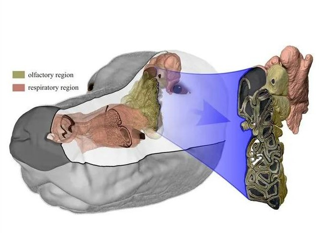 在狗的鼻子的后部是嗅觉区域(黄棕色),其涡卷状组织充满了气味受体;呼吸区域显示为粉红色。