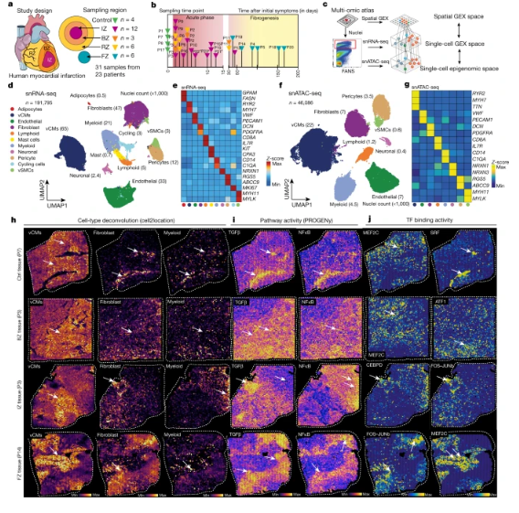 多模态数据集成使研究者能够以更高的分辨率评估心脏细胞类型组成,通过鉴定损伤,修复和重塑的不同组织结构来深入了解心脏转录组和表观基因组的变化。他们确定并验证了主要细胞类型的疾病特异性心脏细胞状态,并在其空间背景下对其进行了分析,评估了它们对其他细胞类型的依赖性。研究数据阐明了人类心肌组织组织的分子原理,概括了缺血性损伤后逐渐的心肌细胞和髓系连续体。综上所述,研究提供了人类心肌梗死的综合分子图谱,代表了该领域的重要参考,并为心脏病的高级机制和治疗研究铺平了道路。