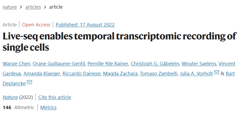 8月17日,来自瑞士联邦理工学院(EPFL)和苏黎世联邦理工学院(ETH Zurich)的研究人员在《自然》杂志发表了题为“Live-seq enables temporal transcriptomic recording of single cells”的研究论文。该论文向人们介绍了一种名为“Live-seq”的单细胞转录组测序分析方案。该方案突破了传统单细胞测序破坏性采样的局限性,能够将在某一特定时间内的单细胞转录组与其在后续时间内的分子及表型行为相联系——即在离散的时间点内监测某一个细胞数千个基因的活性。由于此特点,研究者也称此技术为“时间性转录组学分析”。