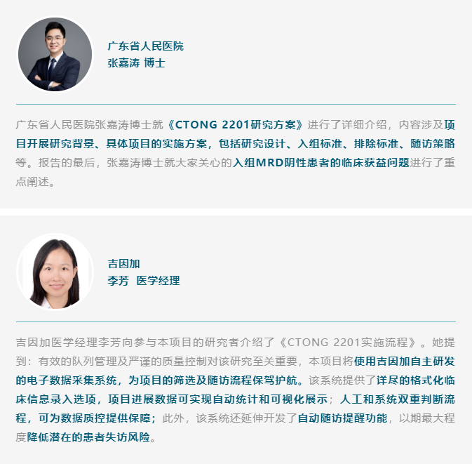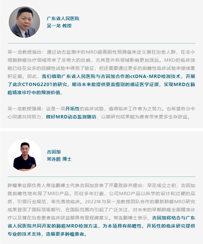 广东省临床试验协会申办,广东省人民医院吴一龙教授牵头,联合北京吉因加科技有限公司“基于MRD阴性的IB-IIIA期非小细胞肺癌完全切除术后动态观察策略的前瞻性、多中心、单臂临床研究”(CTONG2201)广东省人民医院董嵩教授担任会议主持人