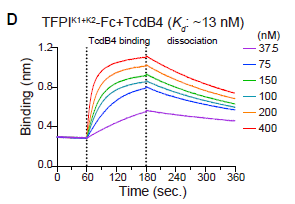 超毒力艰难梭菌感染会导致腹泻、结肠炎和脓毒症等严重的症状,是最常见的病原菌感染之一。TcdB是艰难梭菌的主要毒力因子,在先前的研究中,陶亮及其研究团队表明FZD蛋白是TcdB1/3/5的致病受体[1]。今年3月,陶亮团队进一步揭示了TFPI是超毒力艰难梭菌特异性表达的两种TcdB亚型(TcdB2和TcdB4)的病例相关受体[2],文章中使用大量的BLI结合动力学分析数据进行验证分析。