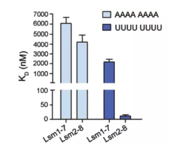 Lsm1-7与8A和8U的亲和力分别为6 μM和2 μM,没有明显差别。Lsm2-8与8U的结合比8A强100倍(20 nM与2 μM)。这就说明Lsm1-7对RNA末端8A的识别水平与Lsm2-8类似的,但是Lsm2-8对8U的结合识别能力更强。
