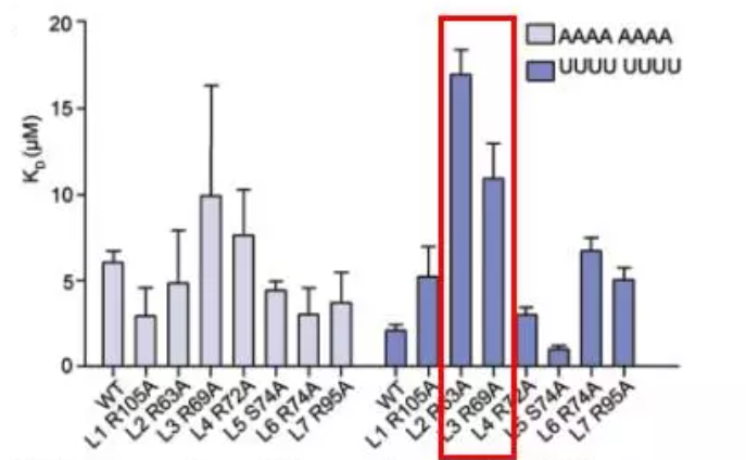 将Lsm1-7当中的一些亚基的某些氨基酸位点进行了突变,然后再与8A和8U的RNA序列进行亲和力检测