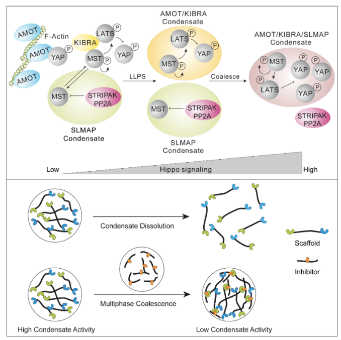 2022年10月31日,美国德克萨斯大学西南医学中心潘多加及郑勇刚共同通讯在Cell 在线发表了研究论文,阐述了Hippo信号通路上游调控蛋白AMOT,KIBRA以及SLMAP通过液-液相分离以及多相合并激活Hippo信号通路的新机制,并提出该机制可能在Hippo信号通路整合多种不同信号中扮演重要角色。该研究表明Hippo信号通路的上游调控因子形成了功能拮抗凝结物,它们结合成一个共同相提供了一种不溶解凝结物而对抗生物分子凝结物功能的模式。