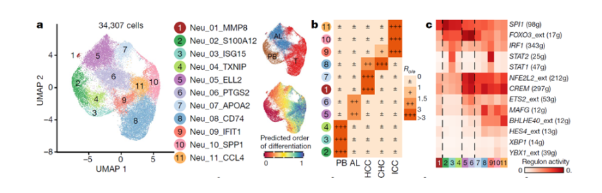 中性粒细胞是一类非常脆弱的细胞,通常认为其在体内进入外周血后存活不超过一周,体外存活不超过24小时。因此,先前的肝癌单细胞研究均未捕获到这一群细胞。得益于快速实验流程和无抗体富集策略,北京大学研究团队成功捕获到3万多个中性粒细胞。经过聚类分析,研究人员共发现11个中性粒细胞亚群,分别富集在外周血、癌旁和肿瘤组织中,并成功鉴定出6群肿瘤相关中性粒细胞。