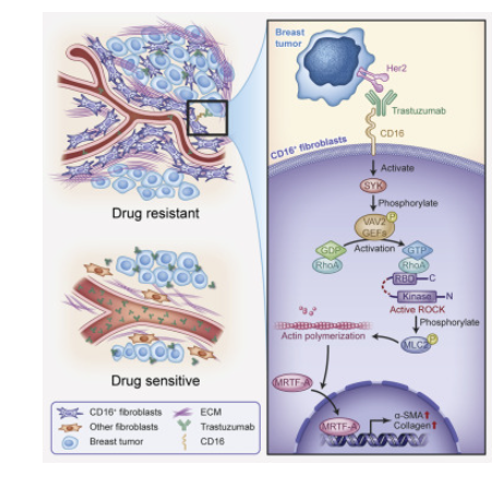 HER2乳腺癌患者中一些细胞的丰度与预后不良和对曲妥珠单抗的反应有关。在功能上,在曲妥珠单抗刺激下,CD16成纤维细胞通过增强细胞外基质硬度来减少药物递送。2022年11月14日,中山大学孙逸仙纪念医院苏士成团队在《Cancer Cell》上发表了研究论文,该研究鉴定出一群表达III型Fcγ受体的成纤维细胞亚群,首次报道促癌的Fcγ受体信号。揭示成纤维细胞Fcγ受体激活后收缩胶原,阻碍药物递送导致单抗治疗耐药机制。