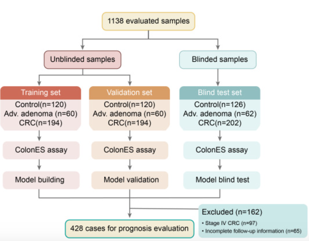 ColonES 检测显示出检测晚期腺瘤和早期结直肠癌的高灵敏度和特异性。如果作为结肠镜前筛查试验,预计随着晚期腺瘤和早期结直肠癌检出率的提高以及预后预测对加强结直肠癌患者临床管理的益处,结直肠癌相关死亡率可能会大大降低。这需要进一步进行验证。