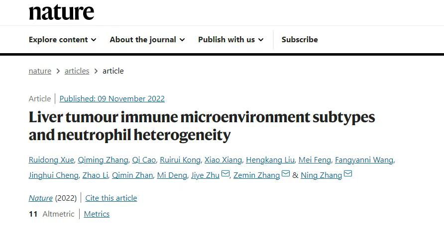 2022 年 11 月 9 日,北京大学第一医院肿瘤转化研究中心张宁团队与北京大学生物医学前沿创新中心(BIOPIC)张泽民团队、北京大学人民医院肝胆外科朱继业团队合作,在 Nature 发表了题为“Liver tumour immune microenvironment subtypes and neutrophil heterogeneity”的研究论文[1]。